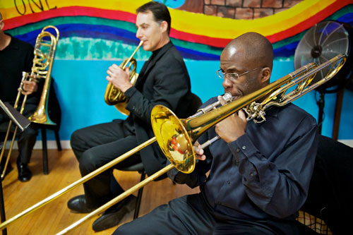In the season of giving, the Detroit Symphony Orchestra, Ford Motor Company and the Michigan International Gay Rodeo Association filled the Ruth Ellis Center with the holiday spirit on Dec. 21. The evening began with a 45-minute concert by the DSO's brass quintet, playing a selection of holiday songs. In addition to the performance, Ford's MODEL team was at the Center handing out care packages of non-perishable food items to the youth. The youth enjoyed a traditional Christmas dinner cooked and served by members of MIGRA.